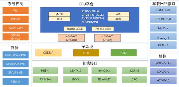 作為國芯科技深耕汽車電子領(lǐng)域多年的標(biāo)志性成果,CCFC3009PT采用RISC-V架構(gòu)6+6核設(shè)計(jì),算力超過10000DMIPS(6個(gè)運(yùn)算主核+6個(gè)鎖步核,也可以根據(jù)用戶需要解耦配置主核與鎖步核數(shù)量),集成專用NPU單元,完全依照汽車智能域控場景的需求量身打造。在工藝層面,該芯片創(chuàng)新性地采用 22nm RRAM 存儲(chǔ)技術(shù),相較于傳統(tǒng)存儲(chǔ)方案,該工藝技術(shù)實(shí)現(xiàn)了存儲(chǔ)密度、讀寫速度與功耗控制的三重優(yōu)化;同時(shí)針對(duì)動(dòng)力域控制場景系統(tǒng)架構(gòu)完成算法執(zhí)行效率升級(jí),能夠充分適配集成化多模動(dòng)力域控、智能底盤、域控中樞等核心場景的高性能與智能化運(yùn)行需求。